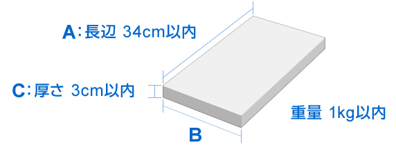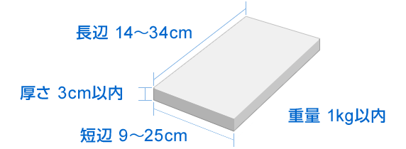 A4サイズの用紙が折らずに入る角形2号封筒程度の大きさで、厚さ3cm、重量1kgに収まるサイズを規格内料金とし、これを超える場合は規格外料金となります。